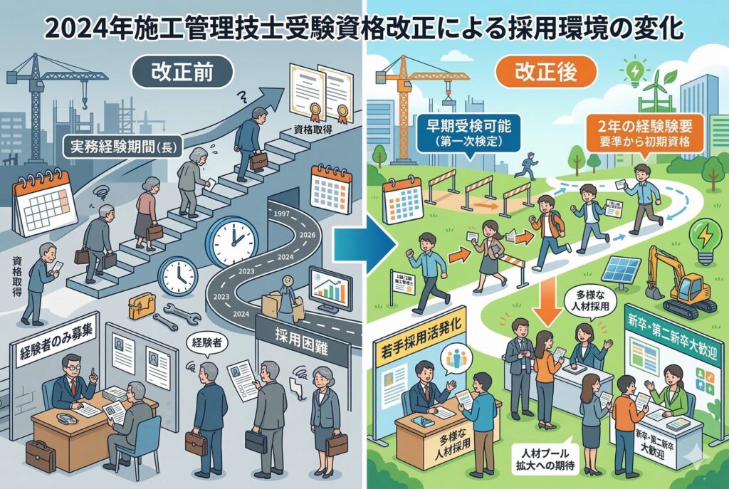 建設業界のこうした状況を受け、国土交通省は2024年4月より施工管理技術検定の受験資格を大幅に改正しました。採用担当者として、この変更点を正確に把握しておくことが重要です。