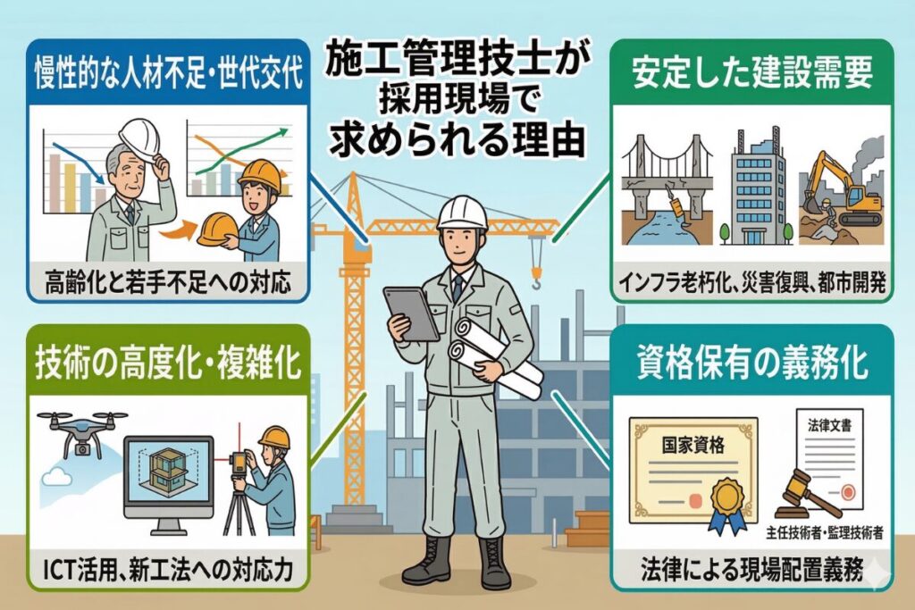 つまり施工管理技士は「いれば助かる存在」ではなく、「事業を続けるために欠かせない存在」。だからこそ、採用ニーズが尽きることがないのです。