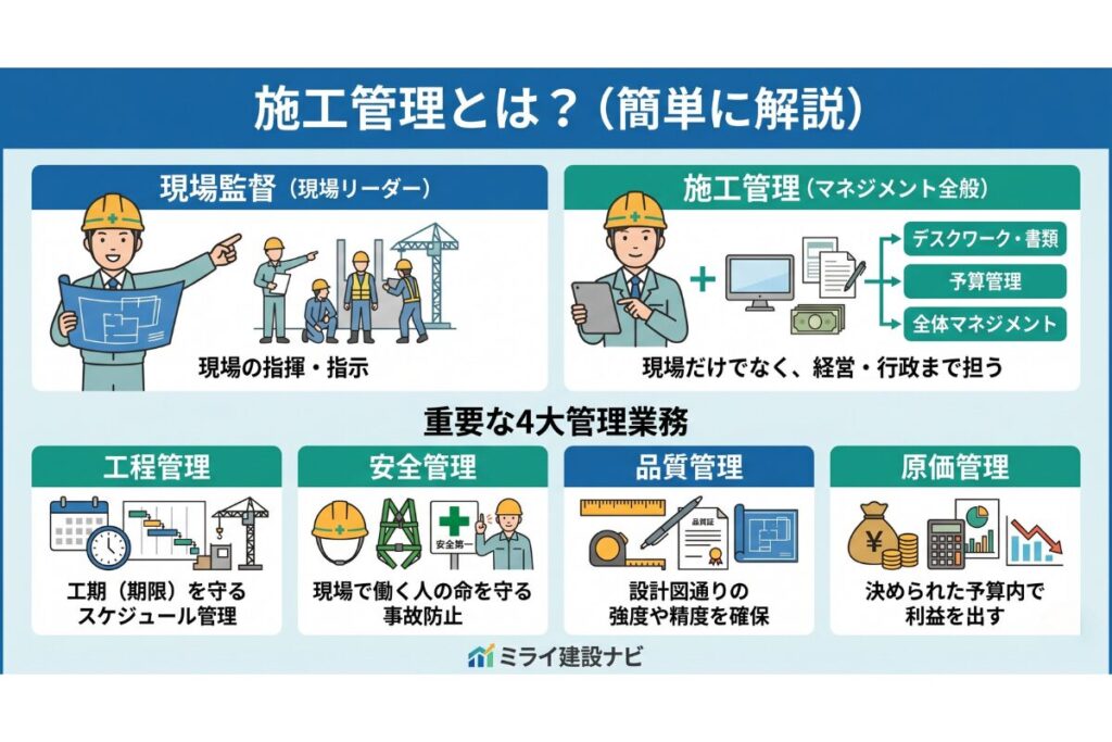 - 施工管理: 現場の指揮に加え、役所への書類提出、予算管理、図面作成などの「デスクワークを含めたマネジメント全般」を指す職種名。