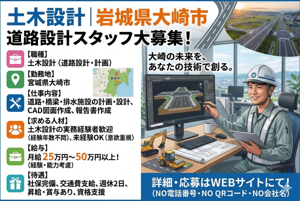 | 仕事内容 | 道路整備・改良工事に関する土木設計業務を担当します。 【具体的には…】 設計条件の整理、設計計算、線形検討、CADによる設計図作成を行います。 発注者や関係機関との設計協議、設計変更対応、設計監理にも携わり、施工性や安全性を考慮した設計を進めます。 内勤を中心としつつ、必要に応じて現地確認を行います。 |