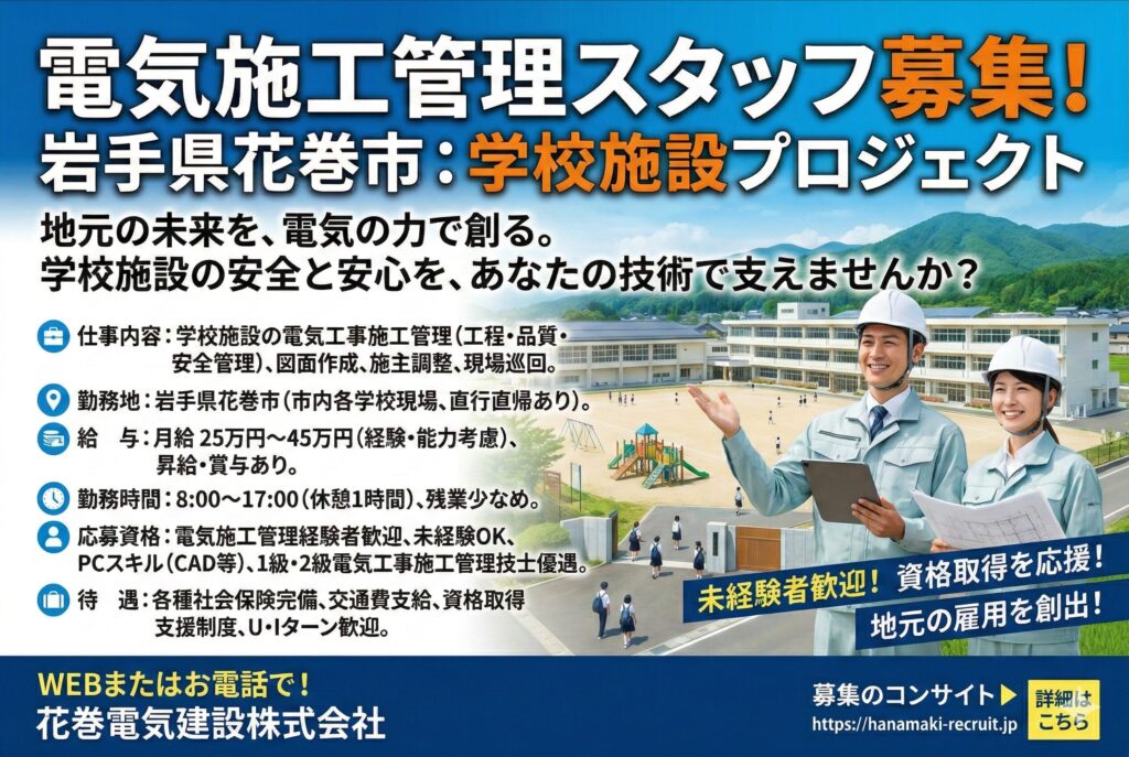 | 仕事内容 | 学校・教育施設の電気設備工事施工管理 学校や教育施設における電気設備工事の施工管理業務を担当します。 照明・動力・弱電設備工事について、施工計画立案、工程・品質・安全管理を実施します。 施工写真管理や書類作成、業者調整も行い、学校行事や利用状況に配慮した工程管理が求められます。 公共性の高い施設で、責任ある仕事に携われます。 |