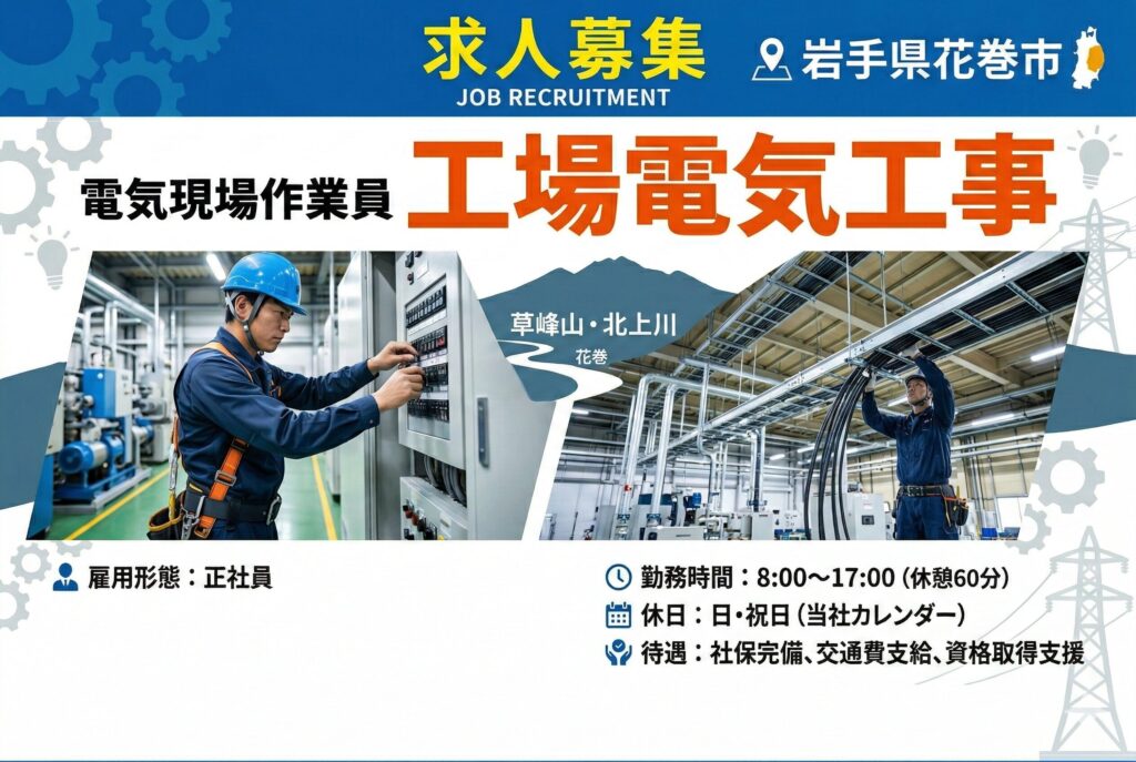 | 仕事内容 | 工場内電気設備工事の現場作業 工場内で行われる電気設備工事における現場作業を担当します。 配線作業や機器の取り付け、点検作業などを行い、安全かつ確実な施工を支えます。 未経験の方でも、作業手順や安全ルールから丁寧に指導します。 現場経験を積みながら、電気工事の基礎知識や技術を身につけられる仕事です。 |