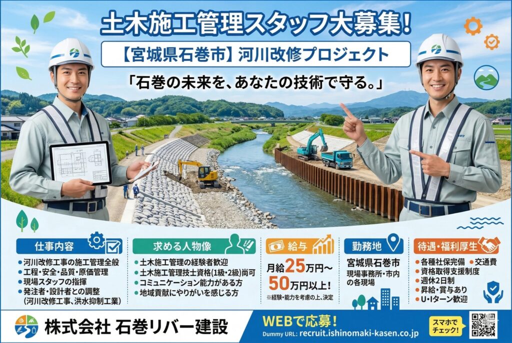 求人コード 359 給与 300,000 ~ 417,000 円/月 職種 土木施工管理 勤務地 宮城県 雇用形態 正社員 法面補強や擁壁工事などを中心に、施工計画立案、工程表作成、協力会社との打ち合わせを行います。工事 […]