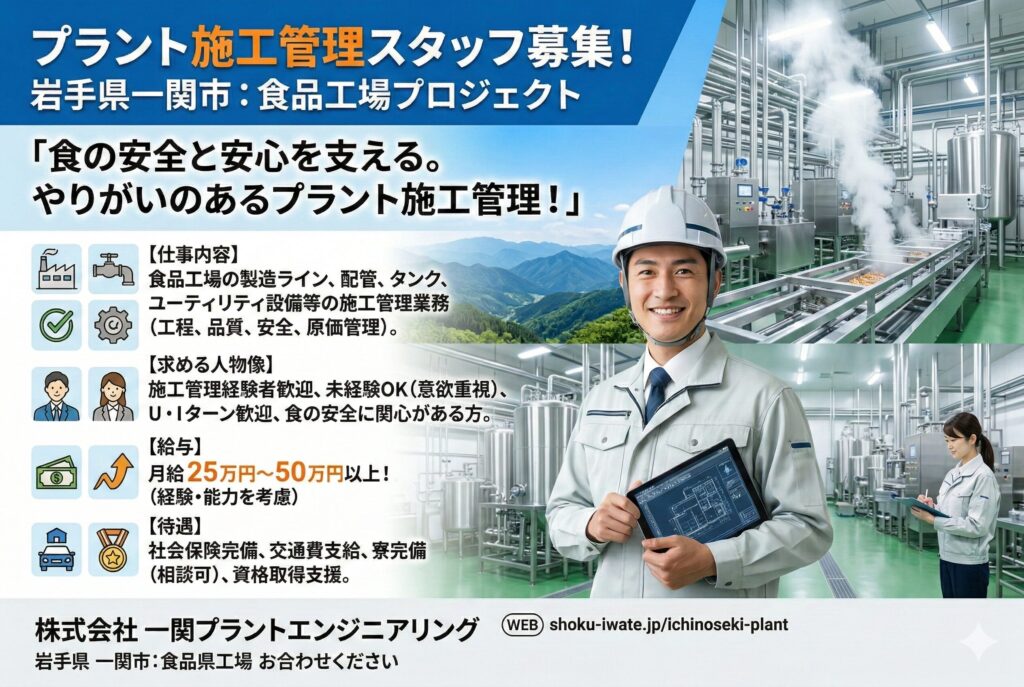 求人コード 344 給与 360,000 ~ 840,000 円/月 職種 プラント施工管理 勤務地 宮城県 雇用形態 正社員 配管・機器据付工事の工程・安全・品質管理、協力会社調整、試運転対応まで一貫して担当します。食 […]