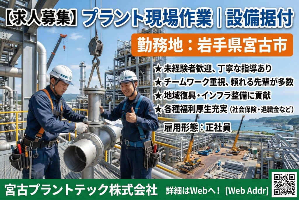 求人コード 355 給与 310,000 ~ 740,000 円/月 職種 プラント現場作業 勤務地 宮城県 雇用形態 正社員 設備解体補助、資材搬出、現場整理を行います。安全管理を徹底しながら作業を進めます。 こちらの […]